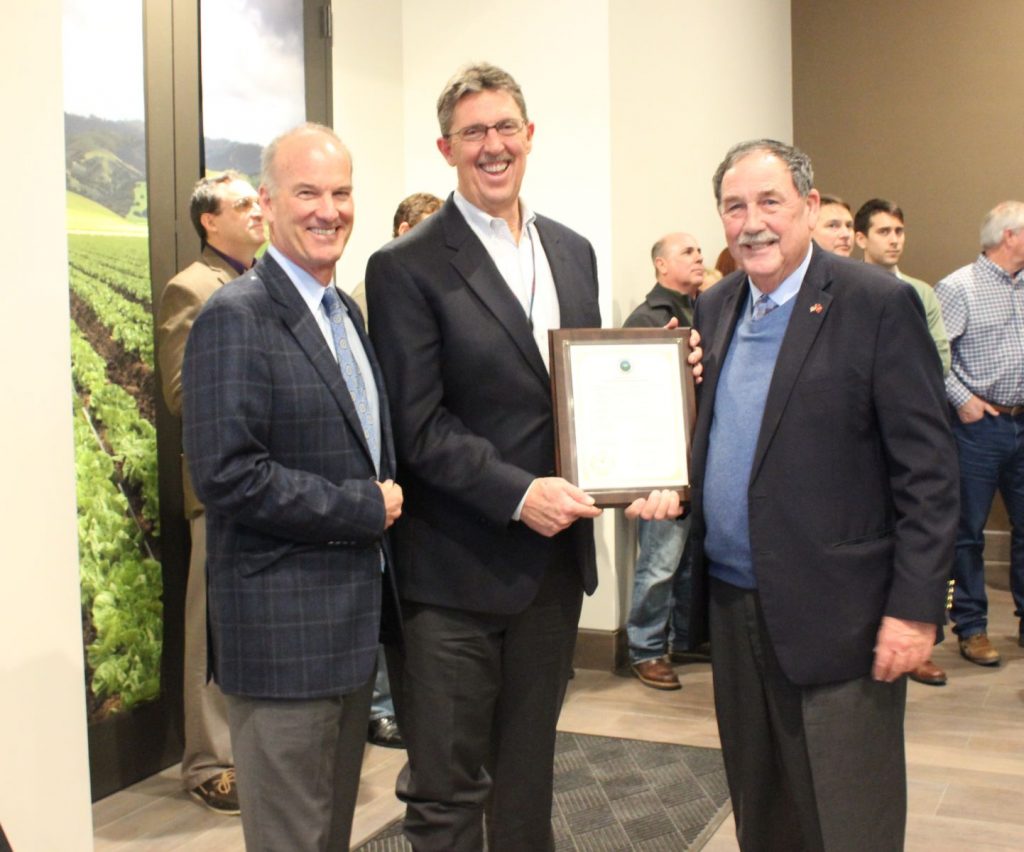 Salinas Mayor Joe Gunter awarded a proclamation to Western Growers Senior Vice President of Strategic Planning, Science and Technology Hank Giclas and Taylor Farms CEO Bruce Taylor, honoring the Western Growers Center for Innovation & Technology for its one-year anniversary. (Source: Taylor Farms)