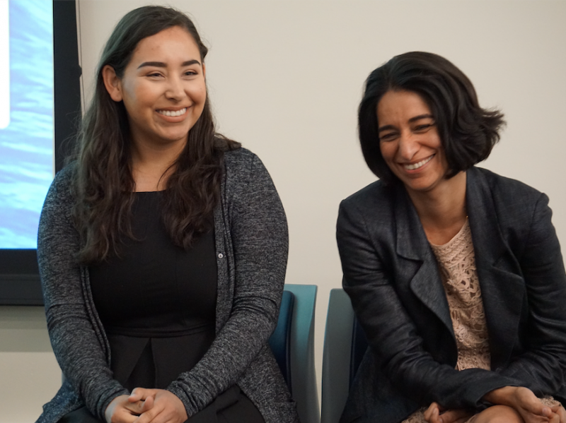 (Photo above: Left, HeavyConnect’s Rivka Garcia and right, AgShift’s Miku Jha share their experiences at the screening of `Farms to Incubators’ at the May 6 Steinbeck Festival. Credit: Iris Nolaso)