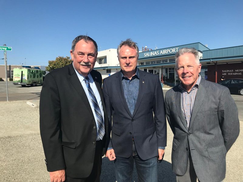 (Photo above: Salinas Mayor Joe Gunter, SVG Partners CEO John Hartnett and Ralph Borelli of Borelli Investment Company announce plans to develop the new THRIVE Business Park adjacent to Salinas’ airport. Contributed.)