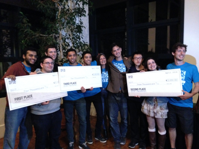 1st, 2nd, and 3rd place winners pose after the HACK UCSC weekend, April 2014. The three students on the right are the Project Slug team.