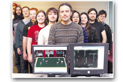 Professor Michael Mateus, Director of the Center for Games and Playable Media at UCSC, with students.
