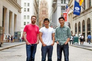 San Lorenzo Valley pals Frank Scott Krueger, left, with brothers Gabriel Otte, center, and Michael Otte on Wall Street in New York where their startup Acornapp.co participated in DreamIt Ventures Accelerator. (Contributed)