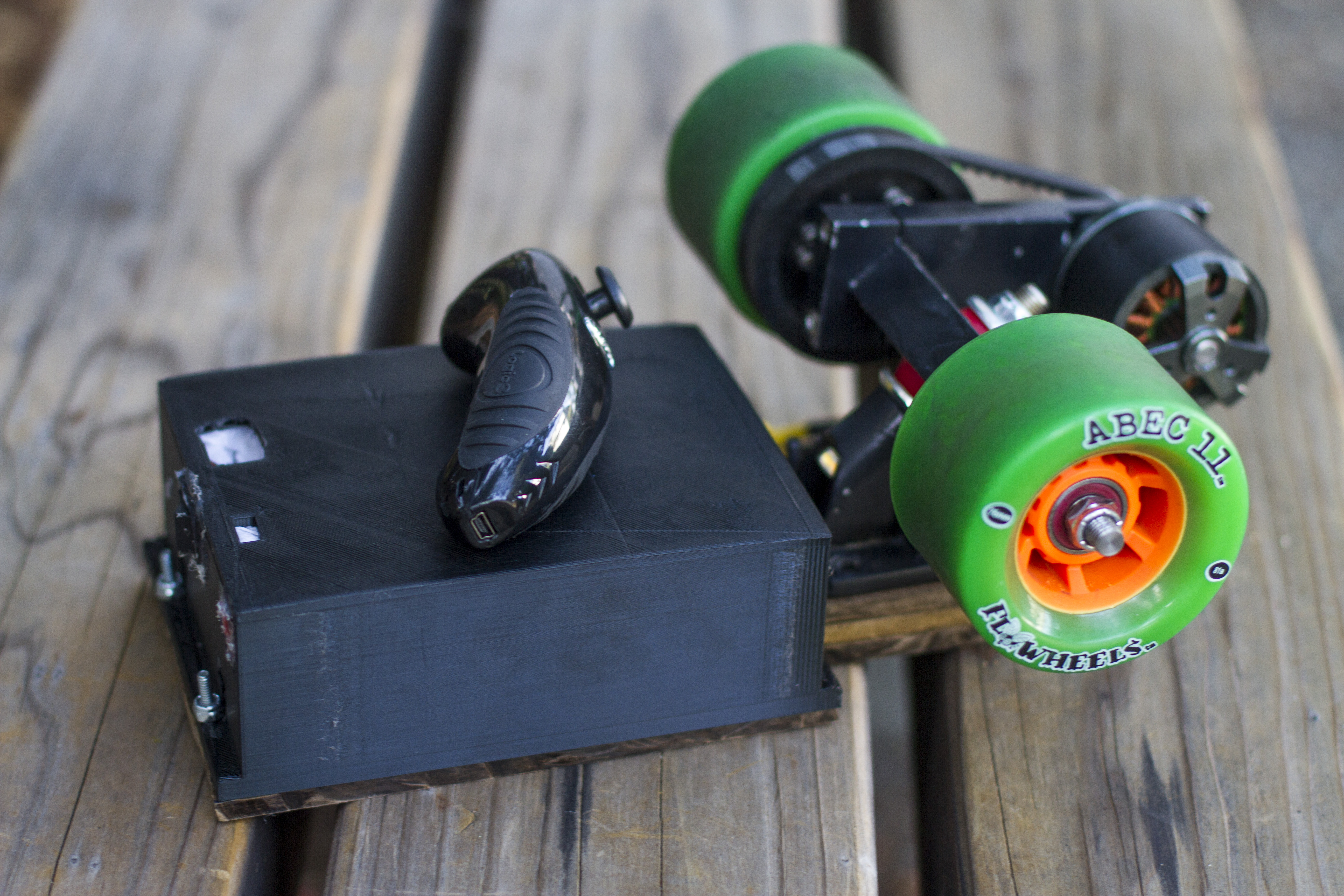 What makes Slithr Electric Vehicles unique is our adaptable base unit and our variety of user interface controller options. Our base unit can be attached to any longboard deck allowing the user to customize their electric vehicle to match their height, riding ability, and style. Additionally, our base unit can use any longboard wheel, allowing the user to further personalize their electric vehicle.