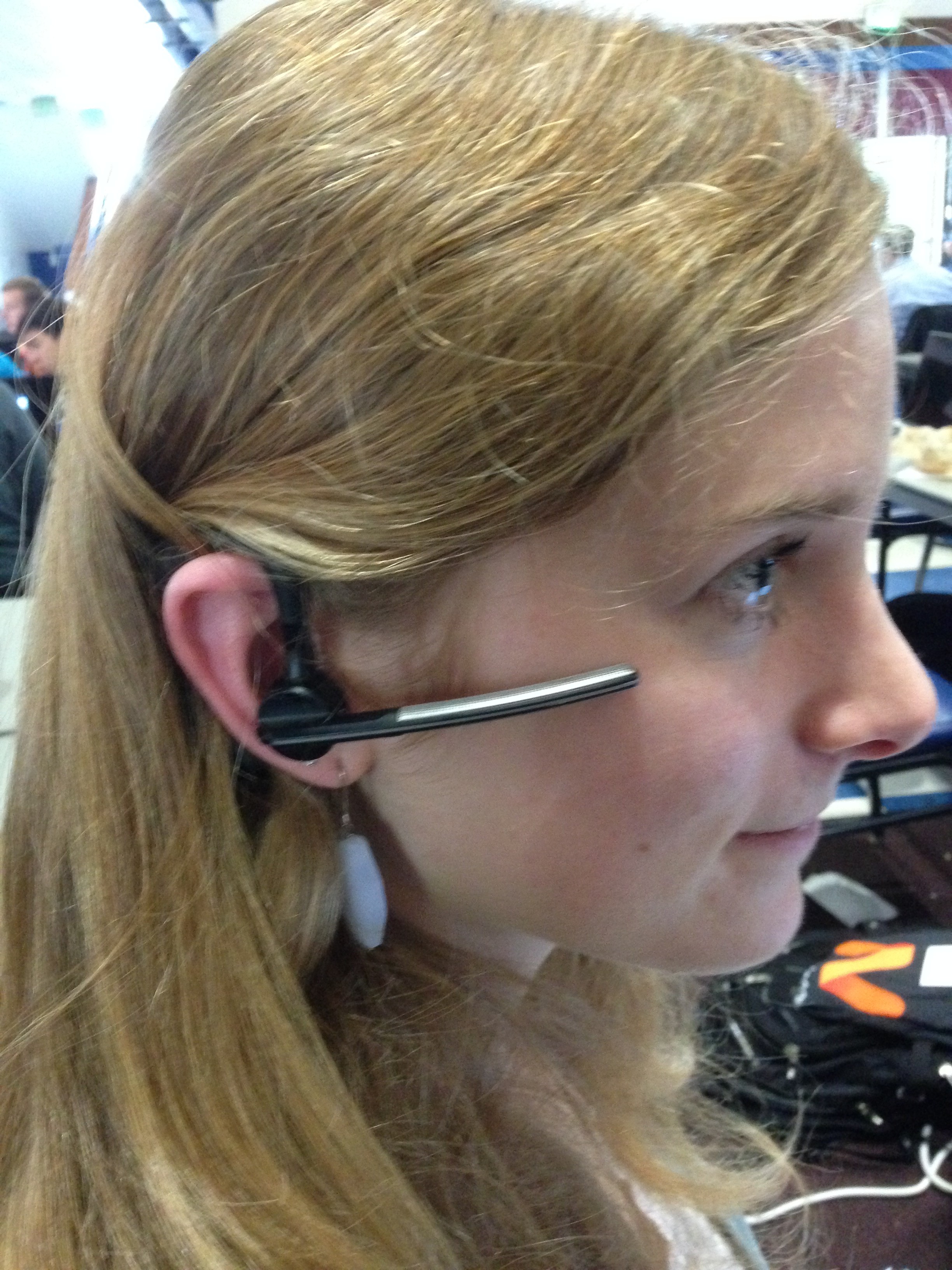 Greenleaf, whom I met in line earlier, has settled into a project that joins Riepe’s request for assistance with the Plantronics Voyager Legend, a Bluetooth earpiece that can detect motion and receive voice commands. Greenleaf is part of a larger CSUMB team. They’re keeping their grandmas in mind as they tentatively plan their project. They hope to use the motion sensor to detect falls and the voice command to ask if the user is alright.