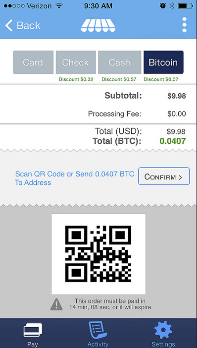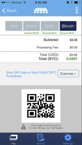 Merchants can swipe customers’ Visa, Mastercard or American Express cards, or offer one of the app’s alternative payment methods. To process a check payment, the merchant simply takes a photo of the paper check, directly debiting the consumer’s bank account without any trips to the bank. To accept Bitcoin, the app displays a unique QR code which the consumer scans to pay with the funds routed to the merchant’s Bitcoin wallet.