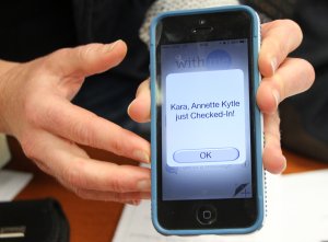 Kara Kytle displays the With Me digital check-in she received while pitching the start up software platform. Credit: Jan Janes.