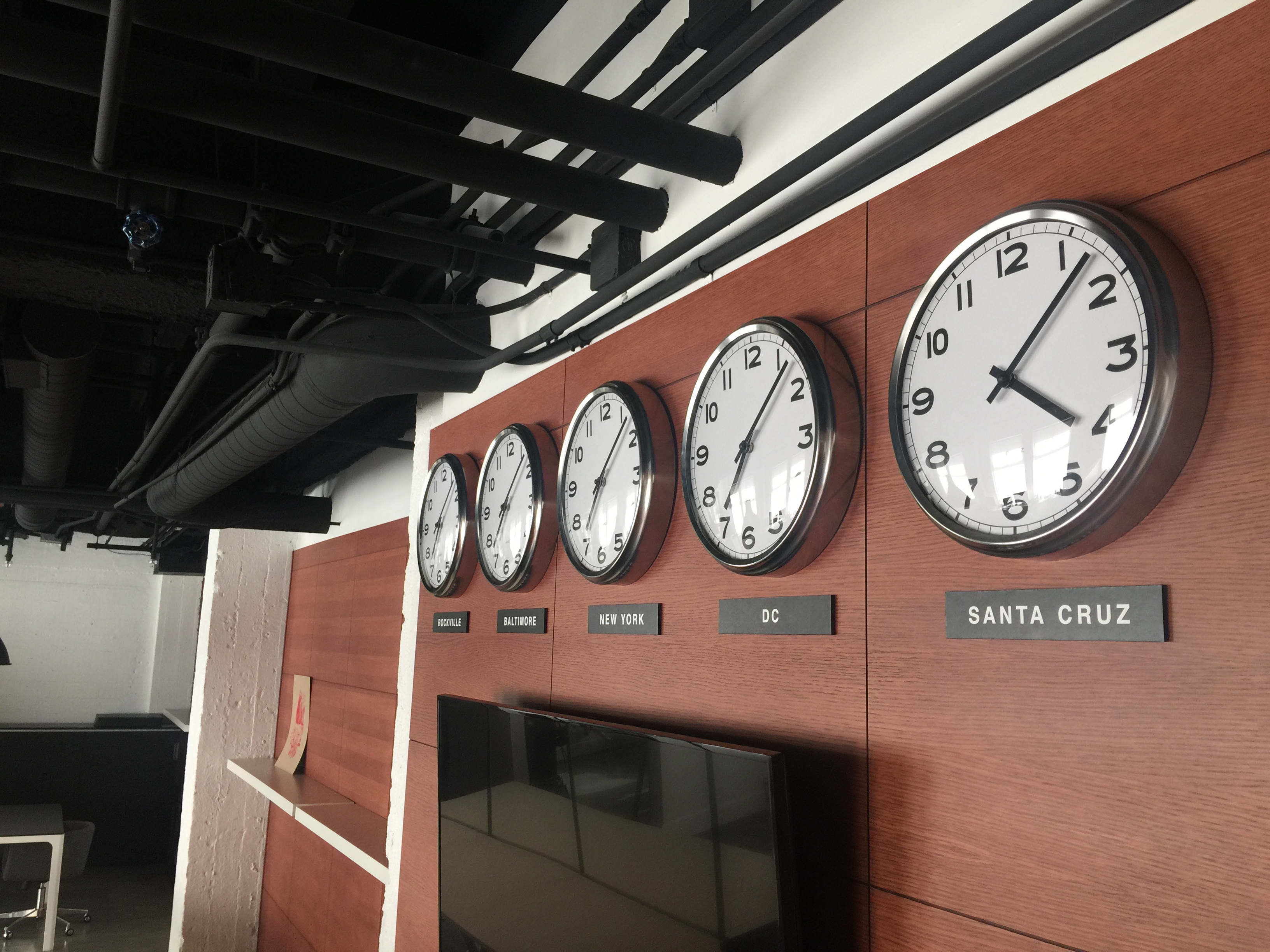 Clocks show the time in each location where HZDG has an office. Santa Cruz is the company’s only west coast location. (Credit: Ted Holladay)