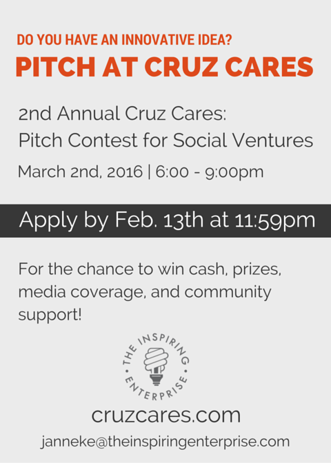 The Inspiring Enterprise opened applications today for our 2nd annual Cruz Cares: Pitch Contest for Social Ventures. The 2nd Annual Cruz Cares pitch competition will be held on Wednesday, March 2nd, 2016 from 6-9pm, at Del Mar Theatre.