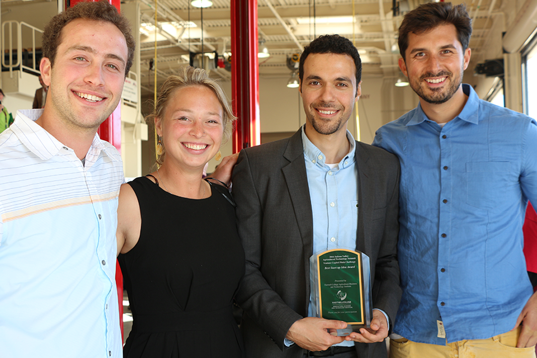 Fish3 partners (l-r) Alex Kalish, Rebekah Cordell, Hesham Alsaati and Kenji Tabery, winners of the 2016 Ag Tech Summit Best Start-up Idea Award for their idea to create a solar powered, closed loop system combining aquaponics and aeroponics to alleviate food insecurity problems. (Credit: Jan Janes Media)