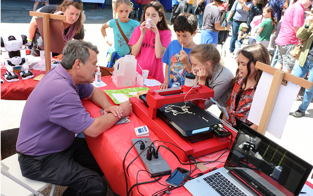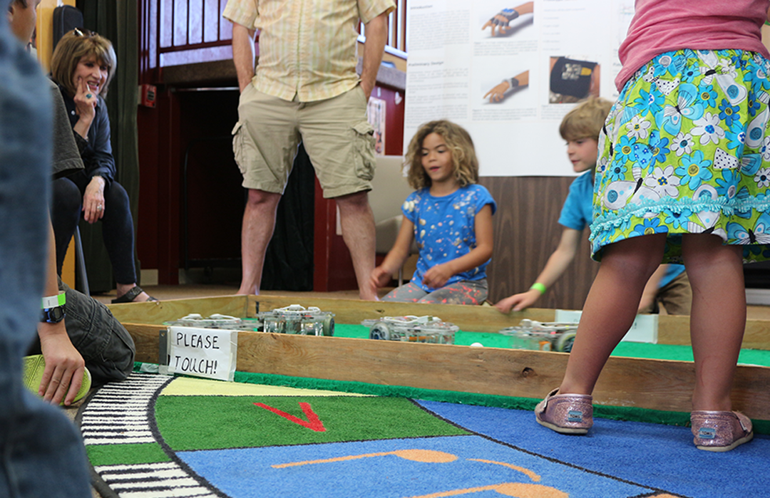 “Please touch,” the universal invitation of the Santa Cruz Mini Maker Faire, drew children at ground level. At the Robo Cars display, “drivers” compared the speed, responsiveness and maneuverability of the vehicles.