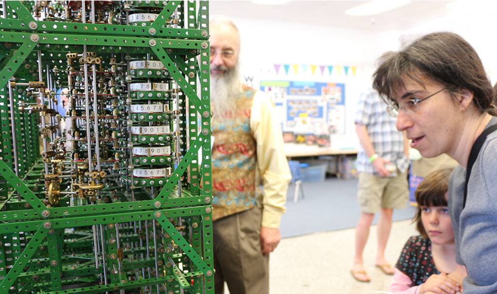 With the turn of a wheel, a replica Babbage computing system built by Tim Robinson (left) resolves another sequence. Constructed using more than 25,000 pieces, the mechanical system computes the numbers in the Four-Figure Mathematical Tables book containing values of logarithms and trigonometric functions.