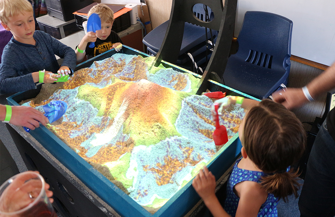 Fascinated youth dug and mounded in an augmented reality sandbox, which uses a depth sensor that sends infrared light down onto the “sand” material and measures the distance. It sends the information back to a computer, which sends the topography color back down as a feedback loop. Oceans appear at the deepest parts, and snow appears as mountaintops are created.