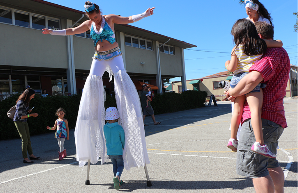 How do you balance on those, anyway? – Stilt walkers Jamie and Sierra pose with the Clarke family after Jamie used the basketball hoop as a coat hanger to hold her shawl. Later, children were encouraged to walk through their “legs.”