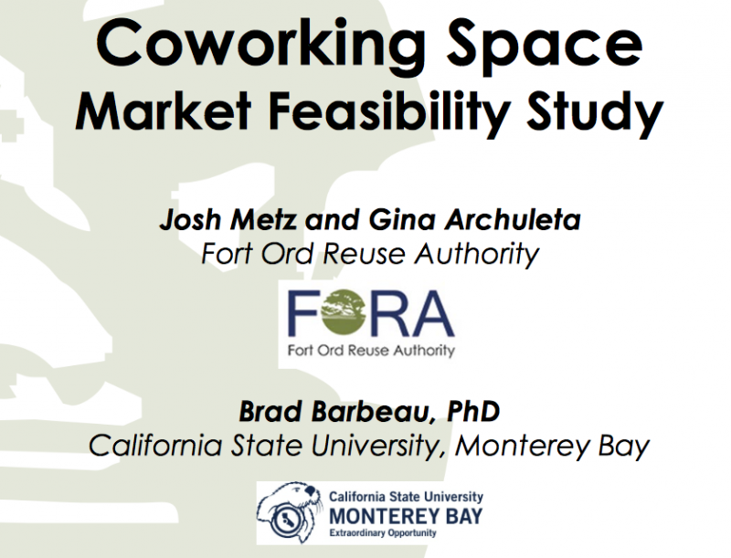 The Fort Ord Reuse Authority and the Institute for Innovation and Economic Development at California State University, Monterey Bay completed a regional coworking space market feasibility report to better understand local market readiness to support investment in coworking facilities.Results of this study suggest an unmet demand for new coworking spaces in the study area. Neighboring communities with similar demographics have a proliferation of coworking spaces, while the study area has few.