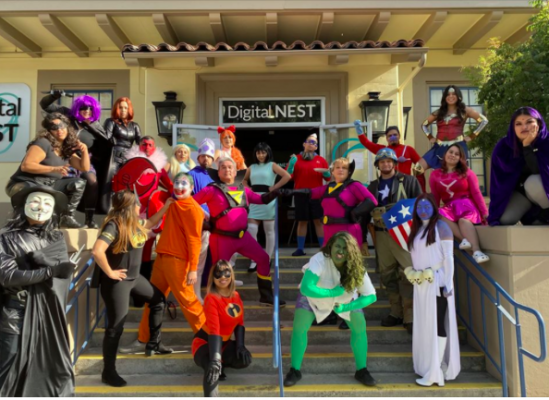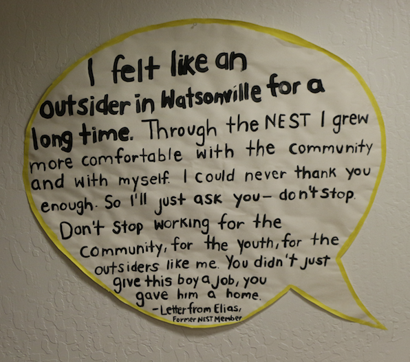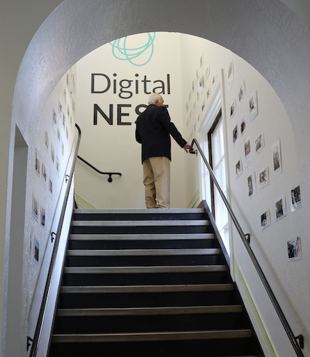 DigitalNEST, located on the Cabrillo College Watsonville campus, originated as a safe space for youth to learn technology skills and pursue career opportunities. The stairway to classrooms display walls of DigitalNEST student successes.