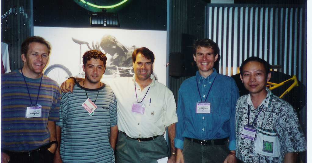 Santa Cruz at the 1996 Interbike Expo in Anaheim, CA. (Left to right) Rob Roskopp, Mariano Gon, Mike Marquez, Hans Heim, and Charlie Wu. (Ibis archives)