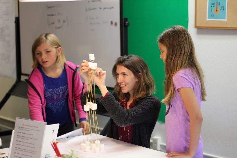 (Photo above: Instructor Morgan Eidam works with students to build the tallest and most structurally sound tower during an offline activity at camp. Contributed.)
