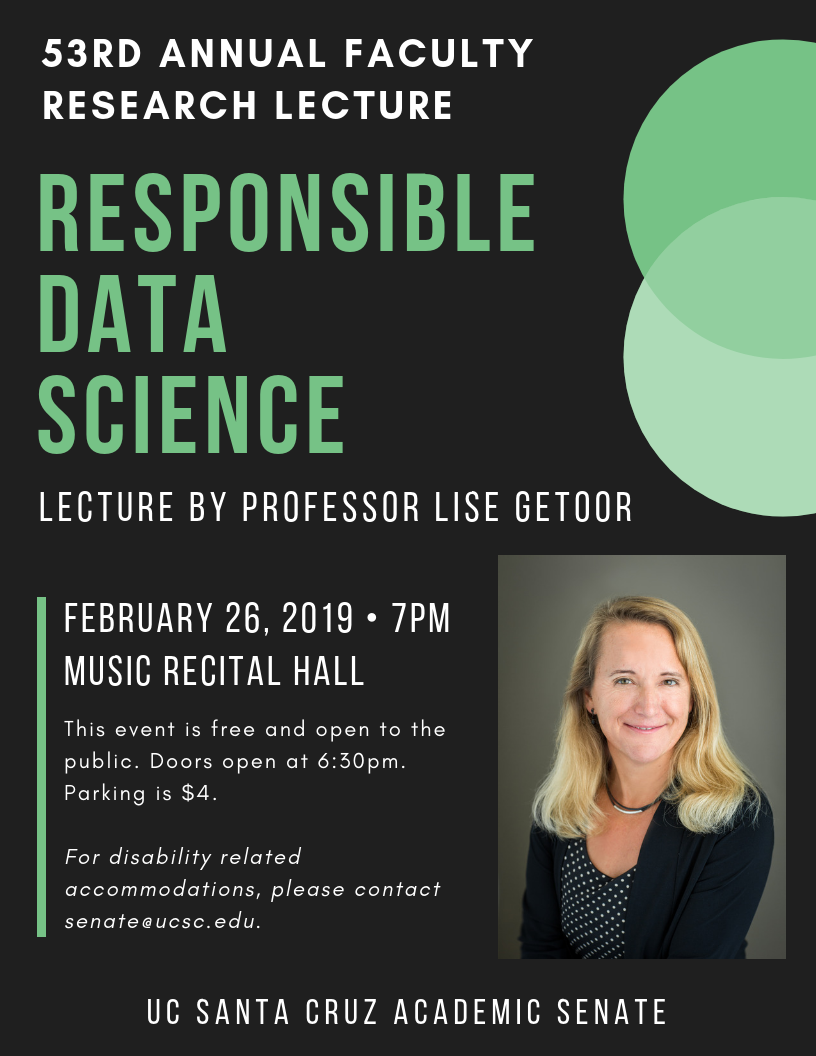 The 53rd Annual Faculty Research Lecture will be given by Professor Lise Getoor on Tuesday, February 26, 2019 at the Music Recital Hall in the UCSC Performing Arts Complex. This event is free and open to the public. Doors open at 6:30pm. The lecture starts at 7pm. Parking is $4.