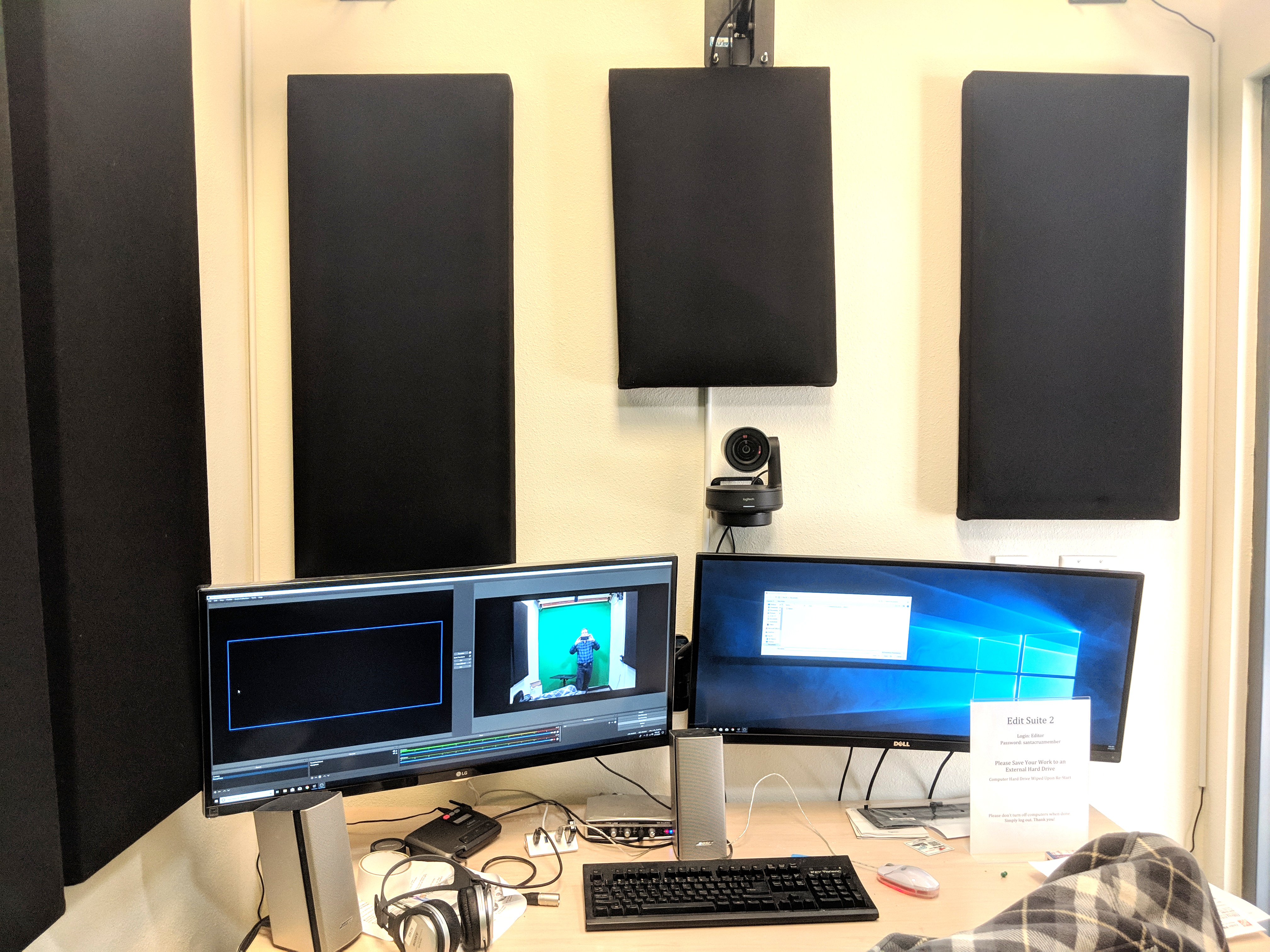We started with the idea of a one person studio. One great example is the “One Button Studio” at Penn State University. Unfortunately the software involved is not open source and is outdated. We found that we could build on another open source project, a video capture program called “Open Broadcast Software” — which is available for most any operating system. We chose a powerful Windows 10 computer with two widescreen monitors and the Adobe Suite. Using OBS’s programmable options made it easy to control video recording with simple mouse button clicks. We added control of the video lighting with wi-fi connected electrical sockets through a Python script. A USB pre-amp with compression converts the output of the Audio Technica shotgun microphone. A 4K compatible Logitech camera captures the video. The Python script has a simple GUI front end to select between using the PowerPoint viewer or a browser. All of the software is open source and available on Github.