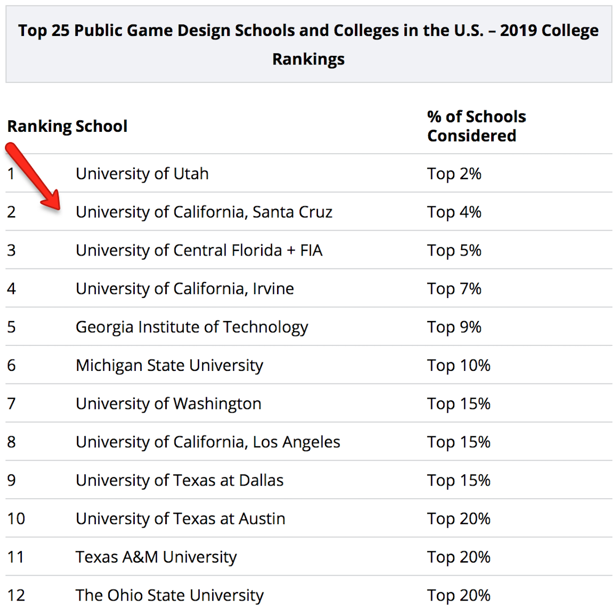 More information here: https://www.animationcareerreview.com/articles/top-25-public-game-design-schools-and-colleges-us-2019-rankings