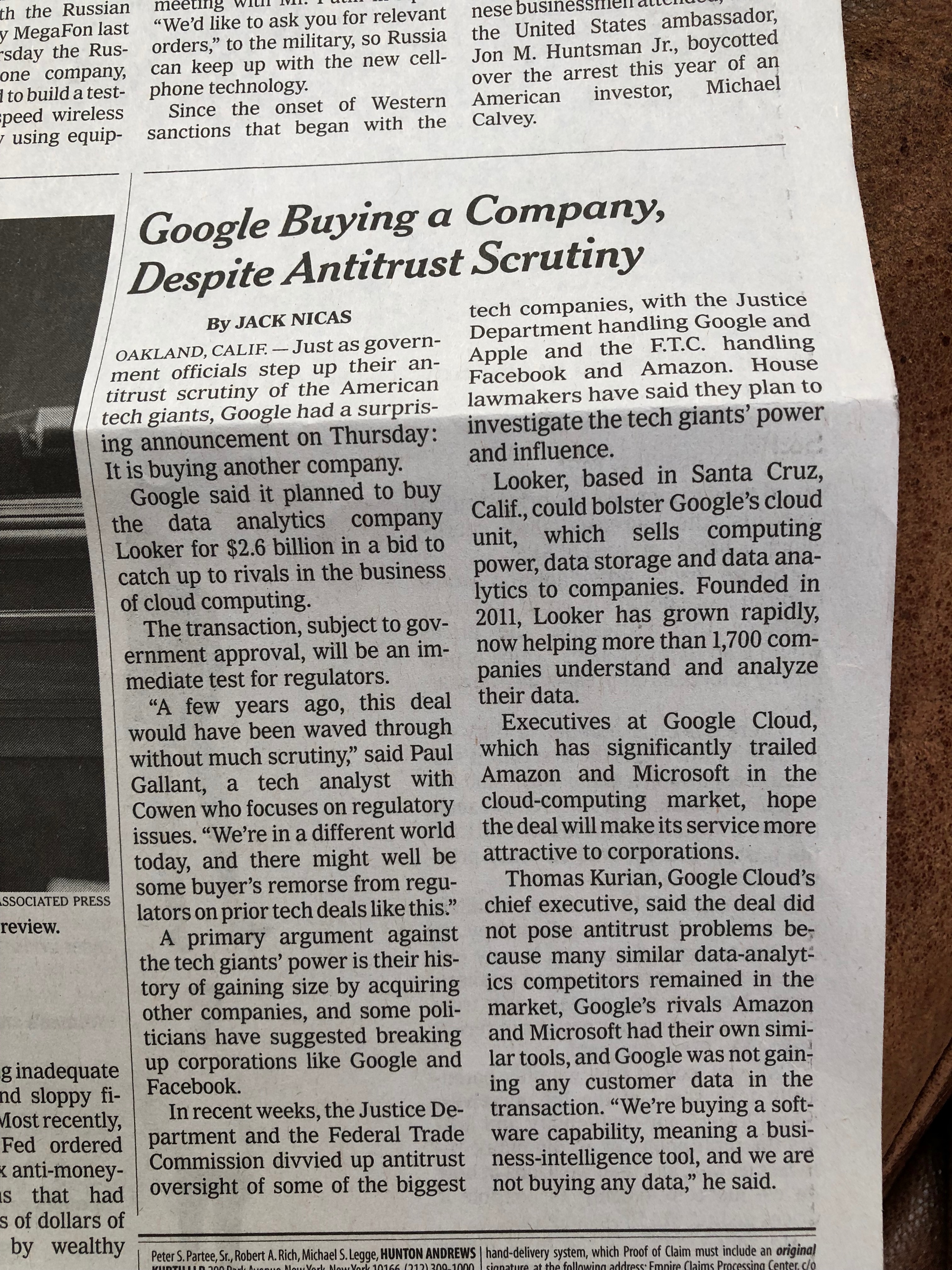 Google to Buy Data Analytics Company Despite New Antitrust Scrutiny (6/6/19)