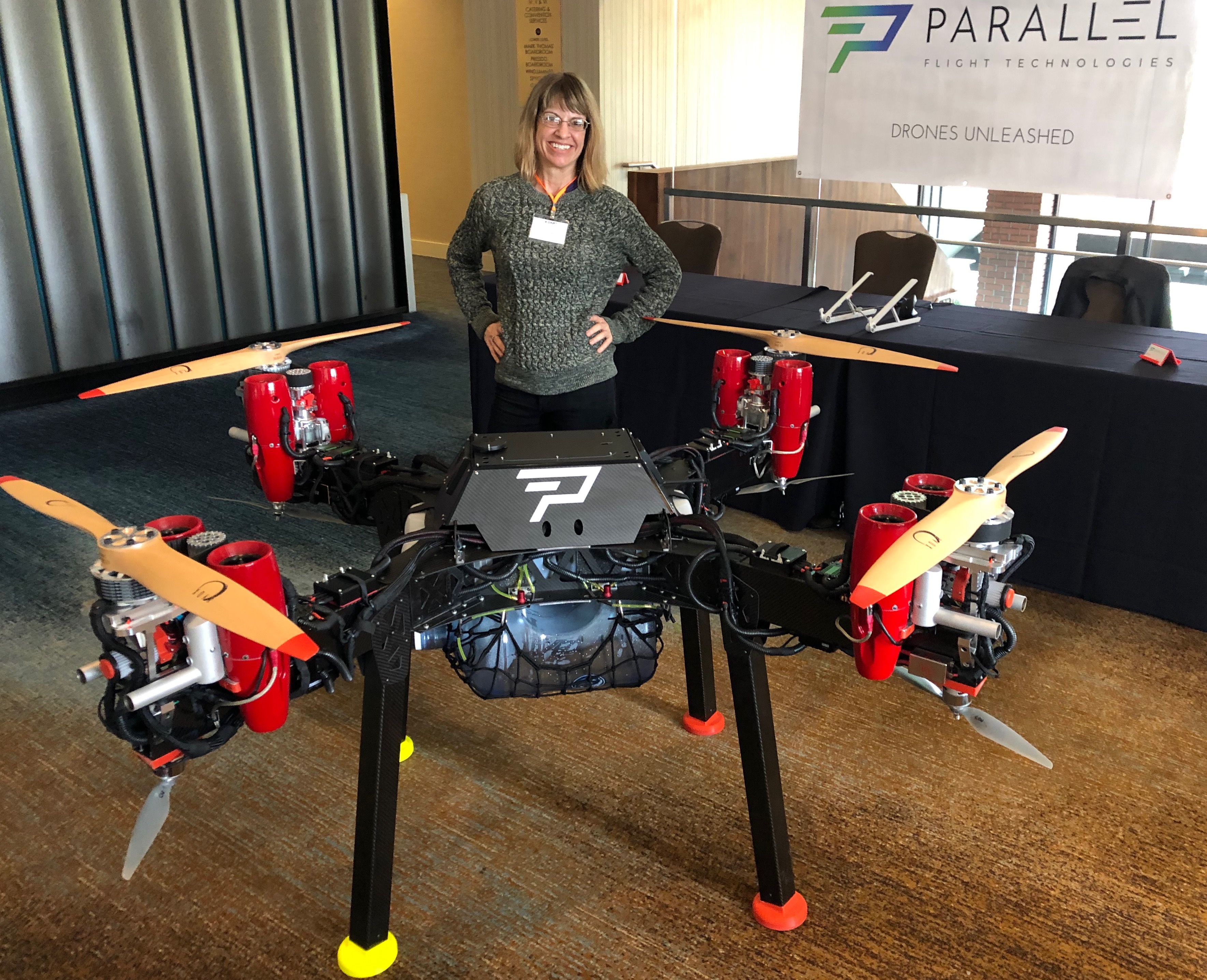 The author, Karen Kefauver, stands in front of one of the drones at the symposium. (Credit: Karen Kefauver)