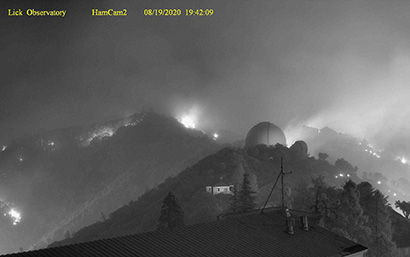 (Photo above: Fires burned around Lick Observatory Wednesday night, as seen in this image from the Mt. Hamilton webcam. Credit: Lick Observatory)