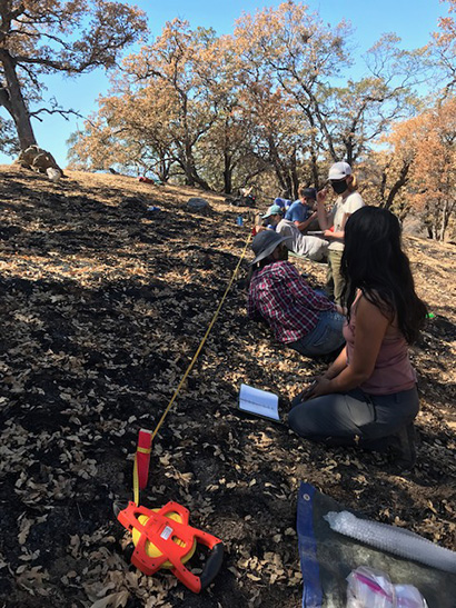 (Photo: Hydrologist Margaret Zimmer’s research team performed a post-fire assessment of their research site at the Blue Oak Ranch Reserve. (Source: Margaret Zimmer)